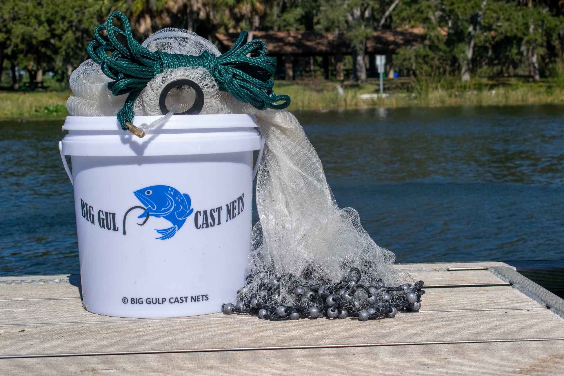 Big Gulp Cast Nets are quality handmade cast nets made of soft and supple monofilament to make for a long lasting and easy to throw net. Each of our specially designed cast nets come with 1.5-lbs per radial foot for super quick sinking. Along with a 6-panel design which helps the net open fully and lie flat once it hits the water, you can catch more bait with less throws and spend more time fishing. Our 100-lb braille lines help secure your haul, and 32-ft hand line allows you to throw from anywhere without worrying about coming up short. Great for all water situations. 12-ft radius with 1/4' mesh 1.5-lbs per foot 6-Panel construction Marble shaped lead for fast sinking 100-lb test braille lines Double lead line 32-ft hand line w/ brass swivel 3.5 gallon bucket w/ lid Forever Free Shipping!!