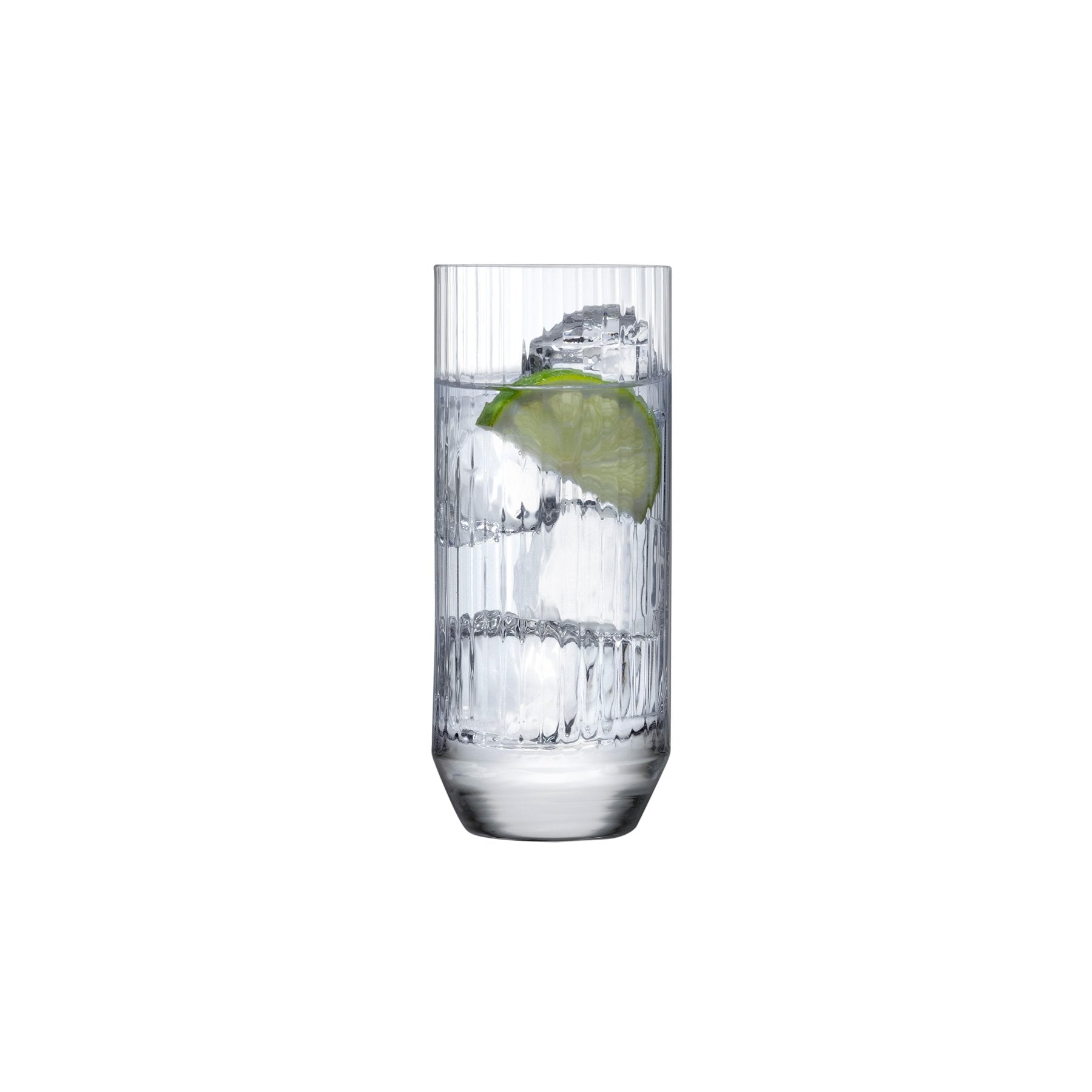 Taken from the NUDE Big Top collection of glassware, this set of four high ball glasses introduces an unrivalled level of chic to any dining table. Cut from clear lead-free crystal etched with a raised linear pattern, this circus-inspired series offers a unique blend of tradition and playful charisma. Each piece has a capacity of 300 cc.