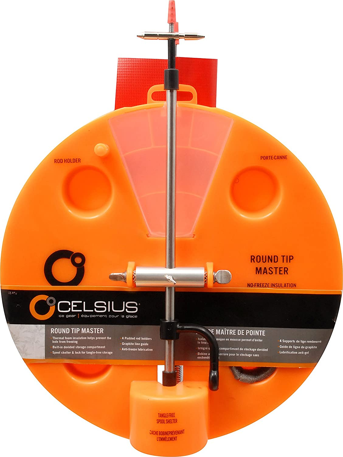 The Celsius Round Tip-Master is a tip up that gives anglers storage convenience when traveling. The Tip-Master can be set inside a bucket and can fit four individual combos, keeping everything from tangling up on the ice. Includes a telescopic flag, a spool shelter and lock to prevent line from being untangled in the bucket.