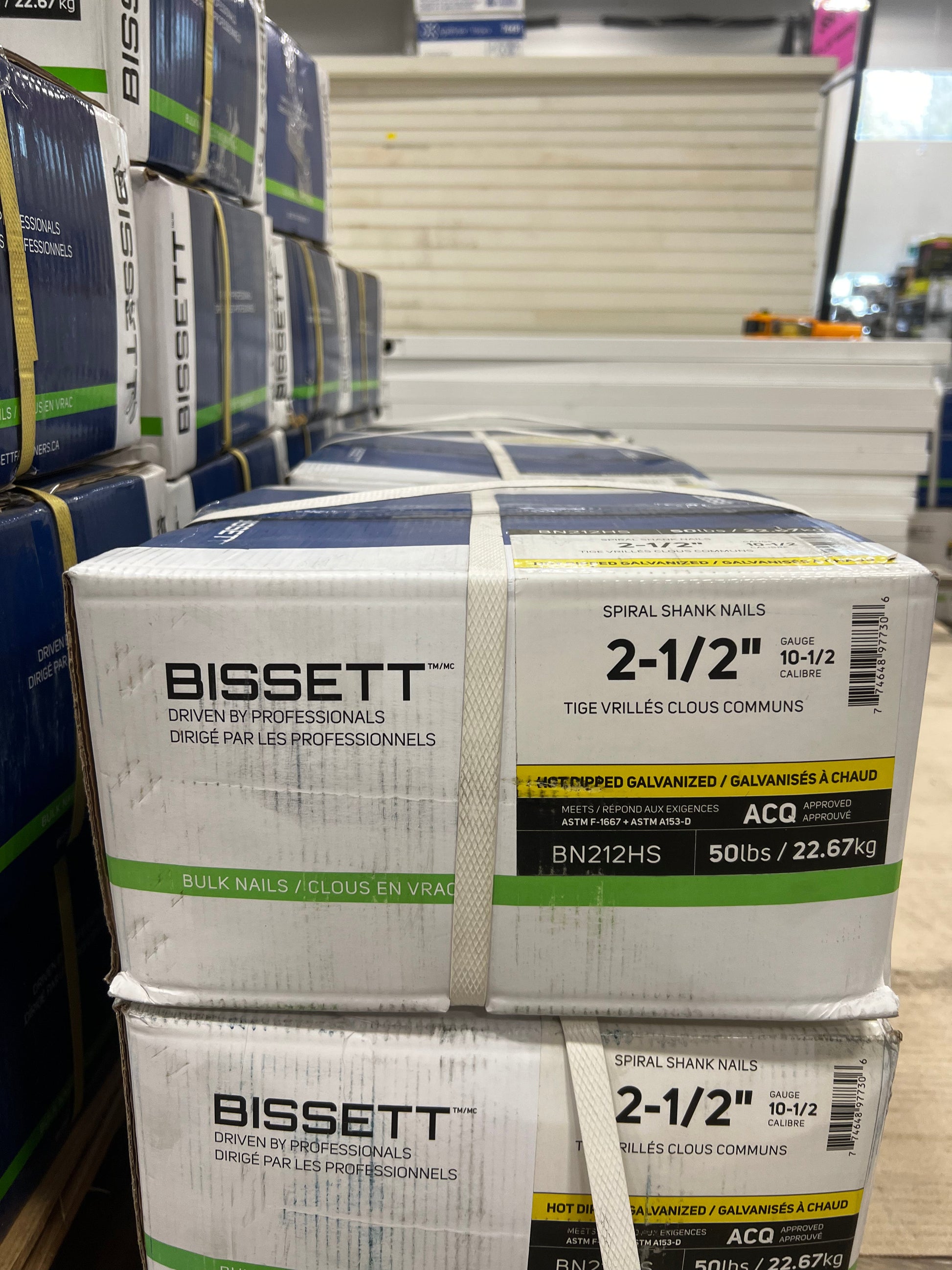 50 lbs box of Bissett hot dipped galvanized spiral shank siding nails. Perfect for contractors or any big projects you may have on the horizon! Available in 2 different gauges. TT