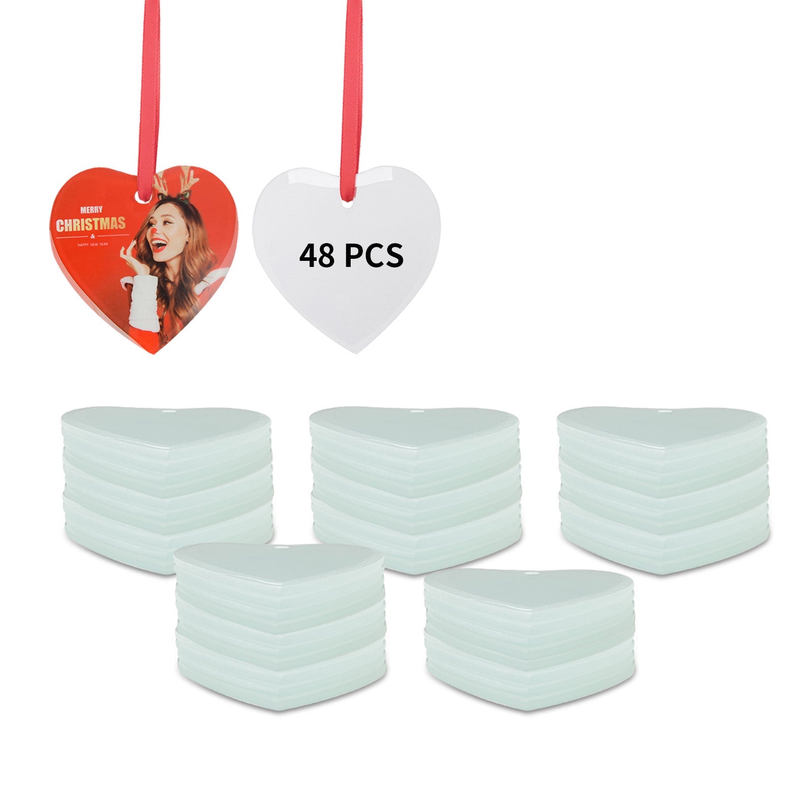 - Specification:Each sublimation heart-shaped glass ornament is 3 Inch,each piece with red ribbon,24 pieces packing with one big white box,outside with the brown gift box.